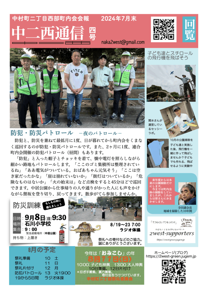 防犯と、防災を兼ねて最低月に1度、日が暮れてから町内会をくまなく巡回するのが防犯・防災パトロールです。また、2ヶ月に1度、連合町内会開催の防犯パトロール(昼間)もあります。